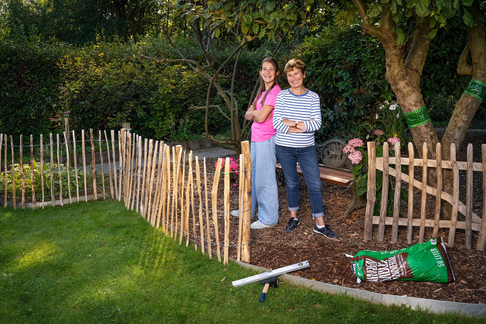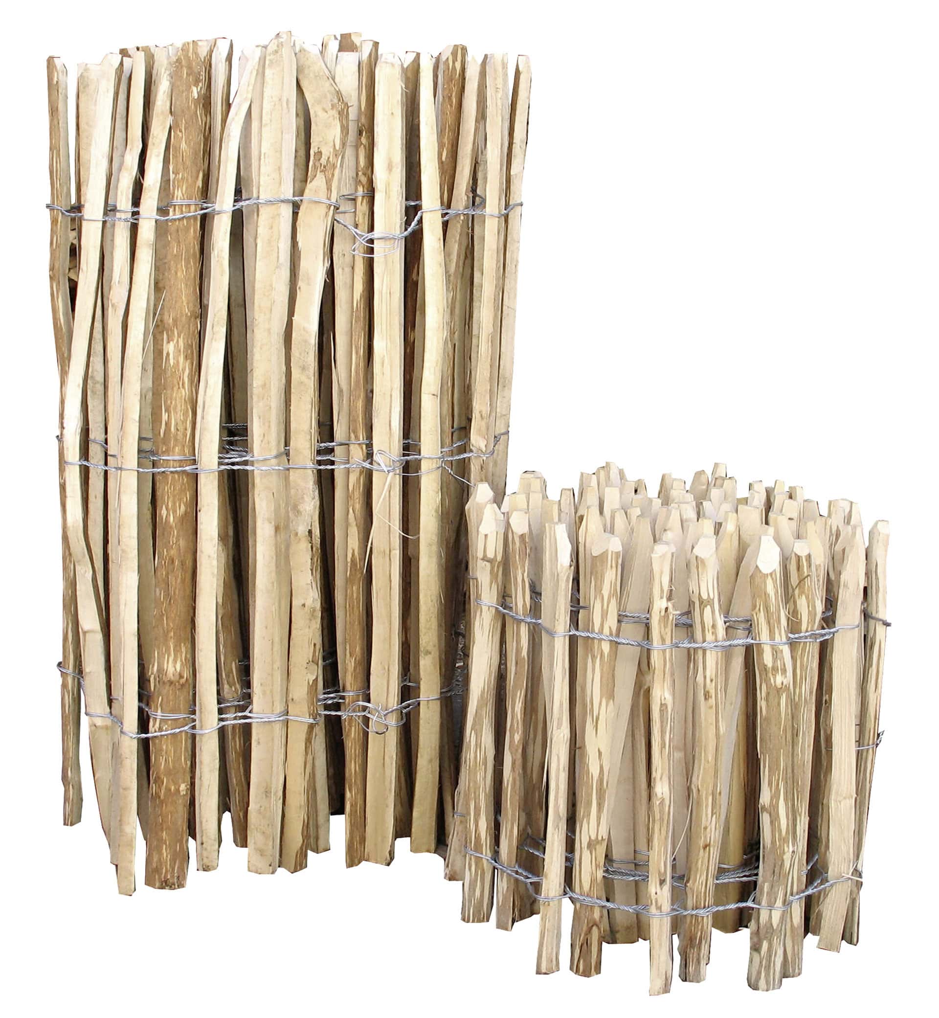 handgespaltene Zaunstaketen, Köpfe angespitzt, mit Bast und Rindenresten, Pforte inkl. Beschlag,